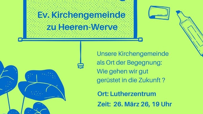 Herzlich willkommen zur Gemeindeversammlung am Donnerstag, den 26. März 2026 um 19 Uhr im Lutherzentrum, Mittelstr. 66. Es geht um Finanzen und Gebäude und wie wir hier vor Ort gut gerüstet in die Zukunft gehen!