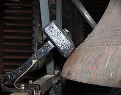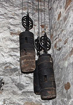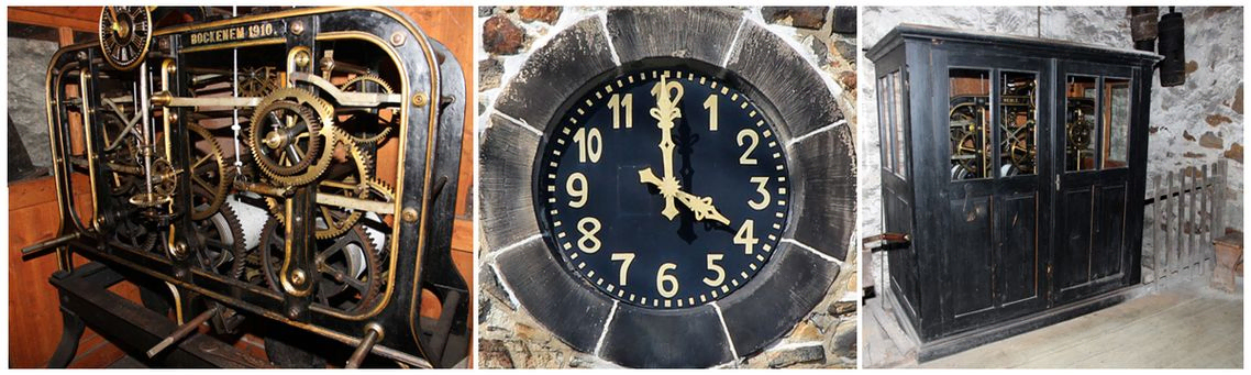 mit einer Kurbel müssen einmal in der Woche die Gewichte hochgezogen werden. Die Viertel-, Halb- und Vollstunden werden durch zwei 12 Kilogramm schwere Hämmer, die durch einen Mechanismus in der Uhr betätigt werden, an zwei Glocken mit unterschiedlicher Tonlage angeschlagen.
